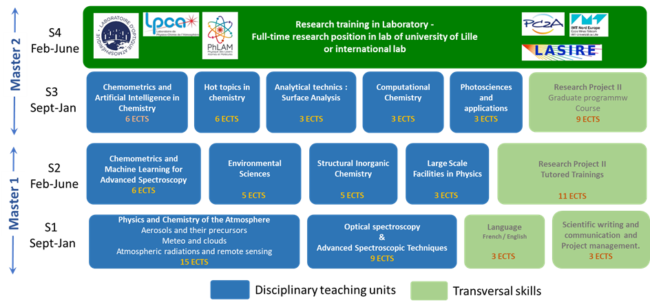 The first semesters (S1 to S3) are dedicated to lectures and practical work, while the last semester (S4, 01 Feb – 30 June in the 2nd year) focuses on a full-time laboratory research project. A large selection of research projects are offered to students.